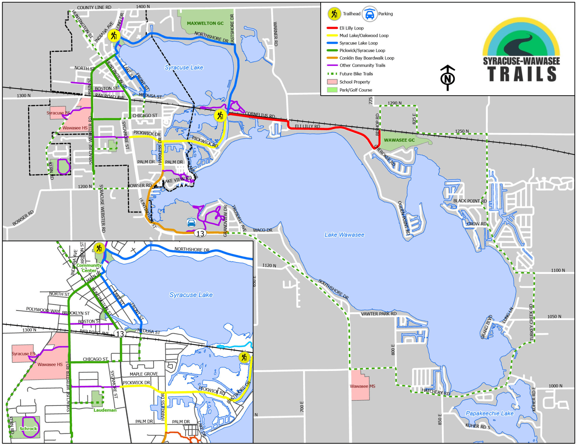 Take a look at our animated Syracuse-Wawasee Trails map. Click on the image to play the animation. Once you have played it, you can zoom in and move around as you would on any other Google map. As we add new sections to the trail, we will update this map. For a link to a printable version (PDF) of this map please scroll down.